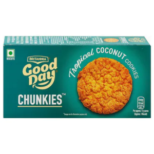 Britannia Good Day Chunkies Crunchy Coconut Cookies are a delightful combination of rich buttery goodness and tropical coconut flavor. These cookies are crafted with premium ingredients to deliver a chunky, crunchy texture with bursts of real coconut flakes in every bite. Perfect as a snack, a tea-time companion, or a treat to satisfy sweet cravings. So what are you waiting for? Go ahead and buy this product online today!