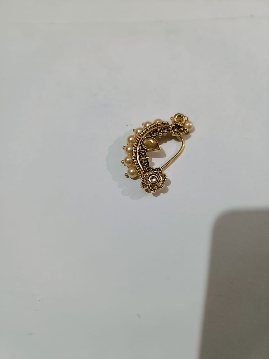 Traditional Maharashtrian Nath Nose Pins Without Piercing For Women is a very important part of the Traditional Maharashtrian jewelry and costume for a bride in India during the wedding ceremony. Nath or Motyanchi Nath or Marathi Nath or Banu Nath Nose ring Without Piercing is a very special unique design nose jewelry of pearls and stone with green and red special types of beads. This is typically a Traditional Maharashtrian Nath style design found mainly in the Marathi families. This is not a fashion style Nath nose ring For Wedding, But does have a meaning and is an important part of the rituals. In other parts of India, it is also known as Nathani or Nathiya. To get that perfect Traditional Maharashtrian look Clip-on Nose rings are a must to wear. Complete your traditional Maharashtrian look by adorning this beautiful Maharashtrian Nath For a Non-Pierced nose (left side). This Nath Nose ring is made up of Metal with Gold plated and simulated pearls with cream-yellow color. Used for left side nostril. In Maharashtra, the typical traditional Maharashtrian nose pin which also is called " Peshwai Nath" was a brilliant masterpiece of jewelry introduced at that time of Peshwa's- around 300 yr back by Royal ladies only. How to Wear - This is a clip-on nath to put on the left nostril of the nose. Just clip on the nose stud on the left nostril and press the backside of the nath nose ring and it will hook onto the nose. This way you can wear it Marathi nose pin without piercin